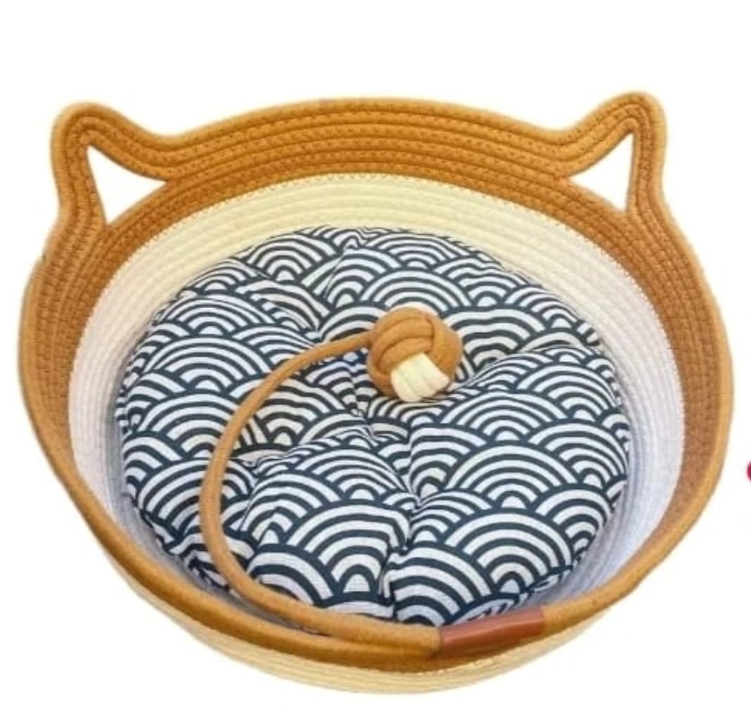 Moises Bali esta realizado en soga tejida resistente, ideal para que los gatos se recuesten.rasquen o jueguen colita con nudo. Incluye almohadon acolchado desmontable y orejitas que le dan un toque tierno a cualquier rincon de la casa.
