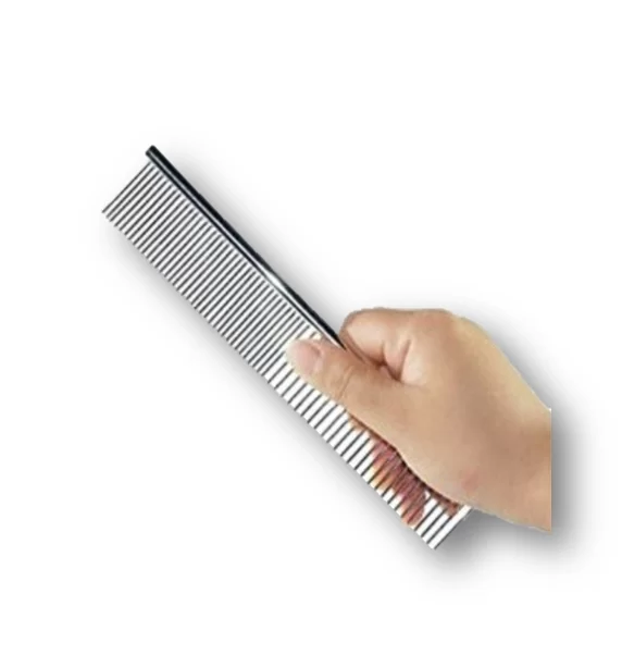 El PEINE METÁLICO DOBLE PASO para mascotas tiene dos tipos de apertura de dientes para cualquier tipo de manto largo o semilargo. Abre nudos fácilmente. Es excelente para quitar el pelo muerto y dar brillo al pelaje.