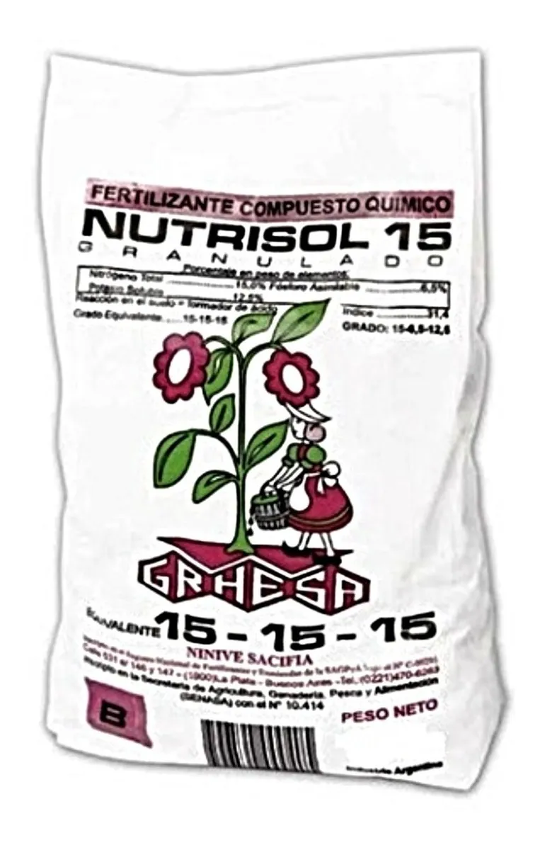Nutrisol 15 es un fertilizante compuesto granulado, que contiene nitrógeno, fósforo y potasio en proporción de 1 a 1. Está constituido en gránulos de disolución lenta, que prolonga la fertilización vegetal. Si es necesario por intermedio de riego abundante se puede acelerar la incorporación del mineral a la tierra.